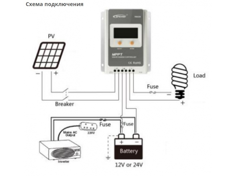 | Максимальная входная мощность от солнечной батареи | 12В - 130Вт; 24В - 260Вт |